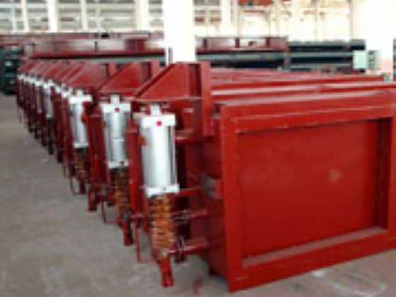 看,制作完工,閃亮的擋板門設備,不負眾望所歸,亮相了。擋板門主要由框架、葉片、密封片、主軸、軸承、軸封、曲柄連桿機構、執行機構(選購件)等幾部分組成。該設備的制作工藝及性能指標都符合相關行業標準。此為擋板門現場展示圖。